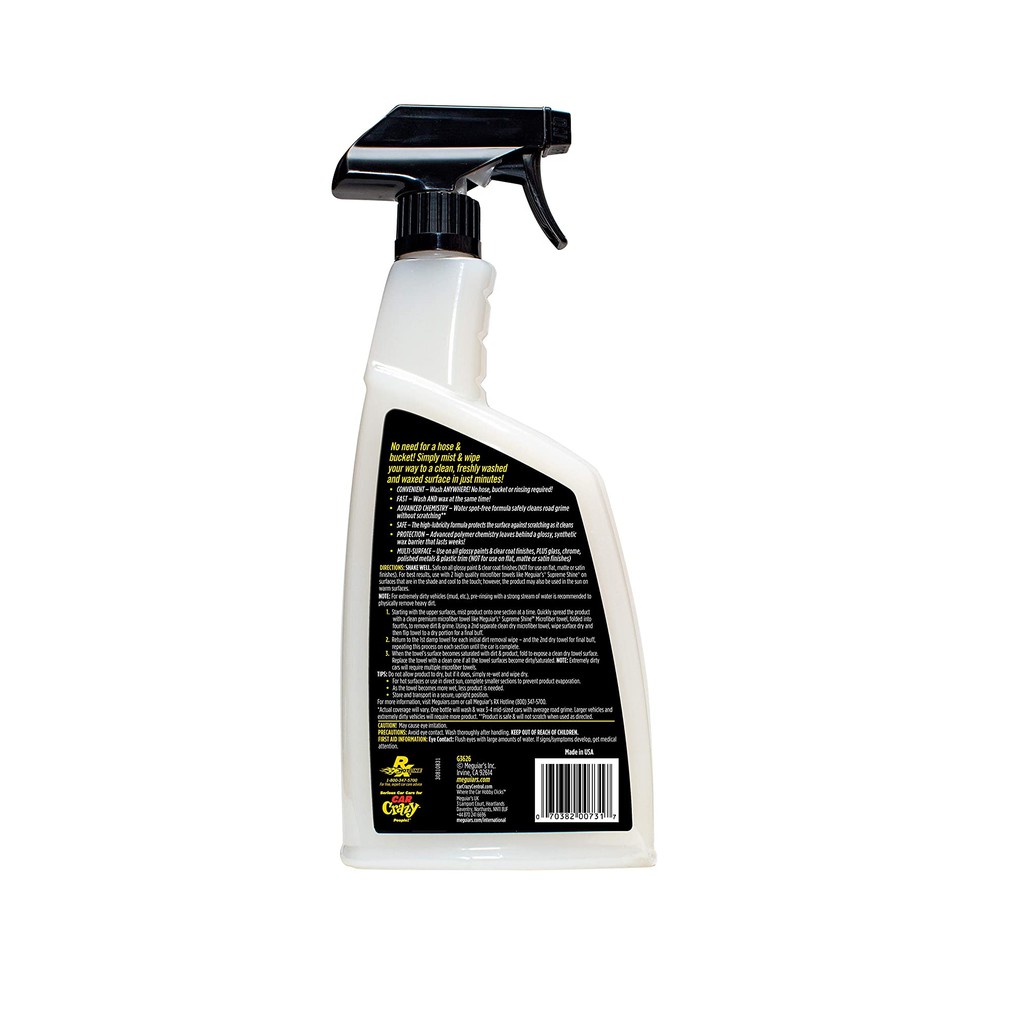 Perfect for urban dwellers, those with limited access to water, or the hot rodder who just arrived at a cruise, Ultimate Waterless Wash & Wax safely lifts away dirt and grime while leaving behind a protective layer of hydrophobic wax. In as little as 15 minutes, this new formula can morph a drab and dirty appearance into a stunning, clean and shiny car, without a drop of water. What's more, depending on how dirty the car is, a single bottle, along with the help of a few microfiber towels, can wash and wax up to five average-sized cars. To use this spray, simply mist onto the surface of the vehicle and gently wipe away using a Meguiar's Supreme Shine or other high quality microfiber towel. Wash and Wax Anywhere spray's unique chemistry insures a scratch-free finish when used as directed, as special lubricants and cleaning agents safely loosen and then gently remove the dirt. Follow with a quick wipe from a clean, dry towel and the surface is left with a beautiful, glossy, just-waxed finish. Waterless Wash & Wax is also safe to use on all wheel types, plus rubber, vinyl and glass.