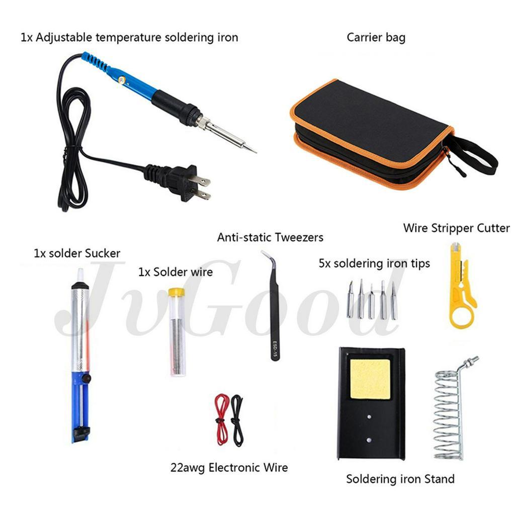 15-In-1 Soldering Kit: 1 x Soldering Iron, 1 x Desoldering Pump, 5 x Soldering Iron Tips(various), 1 x Tin Wire Tube, 1 x Soldering Iron Stand, 1 x Tweezers, 1 x Wire Stripper Cutter, 1 x Cleaning Sponge, 2 x 22awg Electronic Wire , 1 x Fabric Zipper case