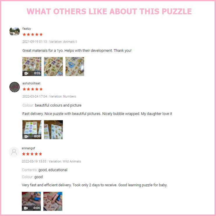 -By solving the puzzles, it helps your baby gets better in concentrating, short-term memory, creative thinking and problem solving