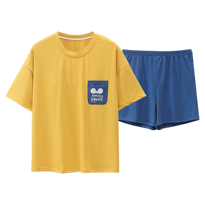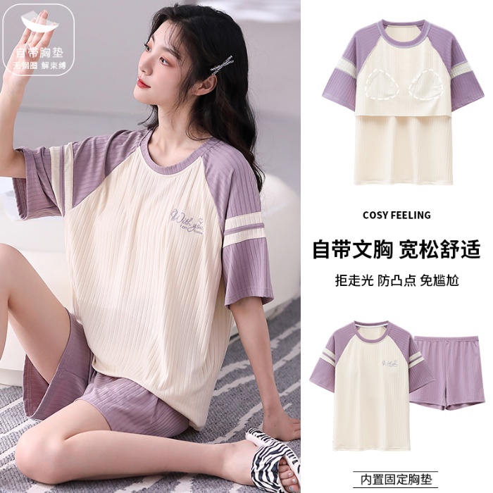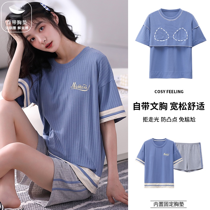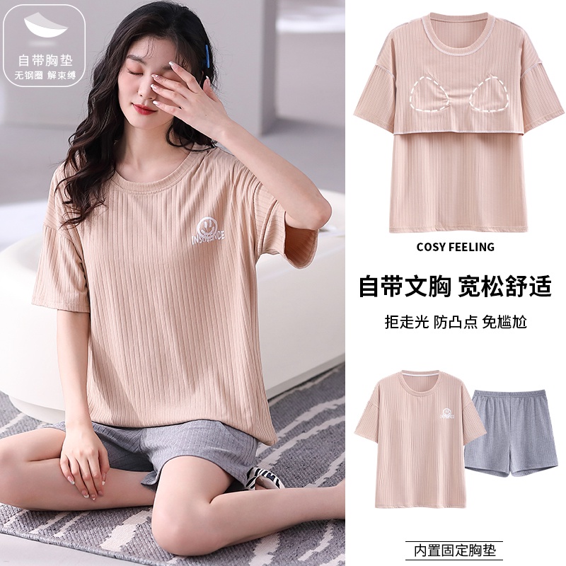 [Kiki's Home] Summer Loungewear Suit With Bra Modal Pajamas Women's With Chest Pad Striped Half-Sleeved t-Shirt Top Shorts Can Wear Outside Breathable Fabric