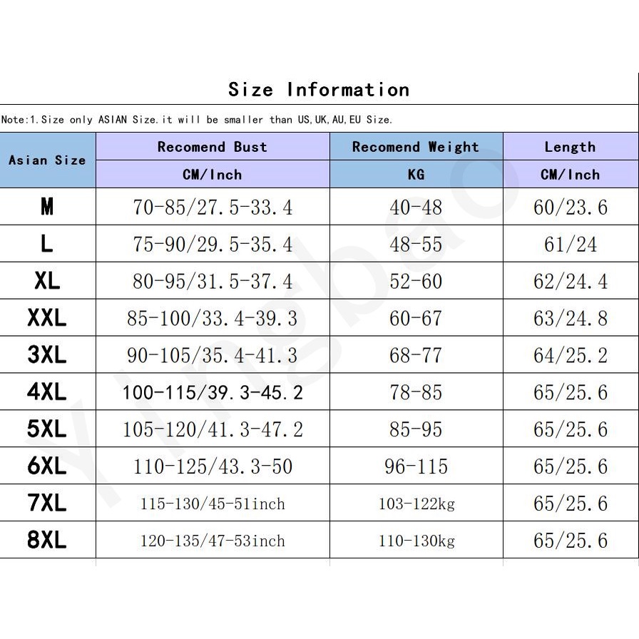 Size 5XL:recomend bust:41-47inch, recomend weight:85-95kg,length:25.6inch