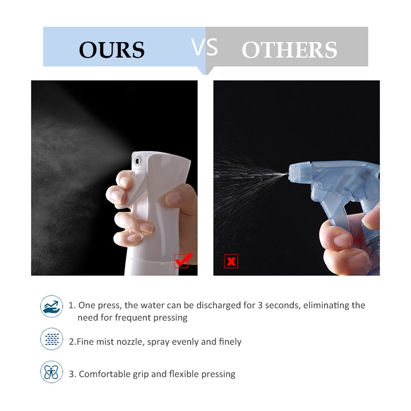 Do you find a suitable spray bottle for you? This product will satisfy your requirement. Adopting ABS material, which is durable for long term use. Its well-sealed nozzle will spray fine mist, very convenient to operate. The spray trigger head with unique design is comfortable to grip and easy to use. Suitable for home use and professional hairdressing salon use. Such a wonderful goods, just bring it home!