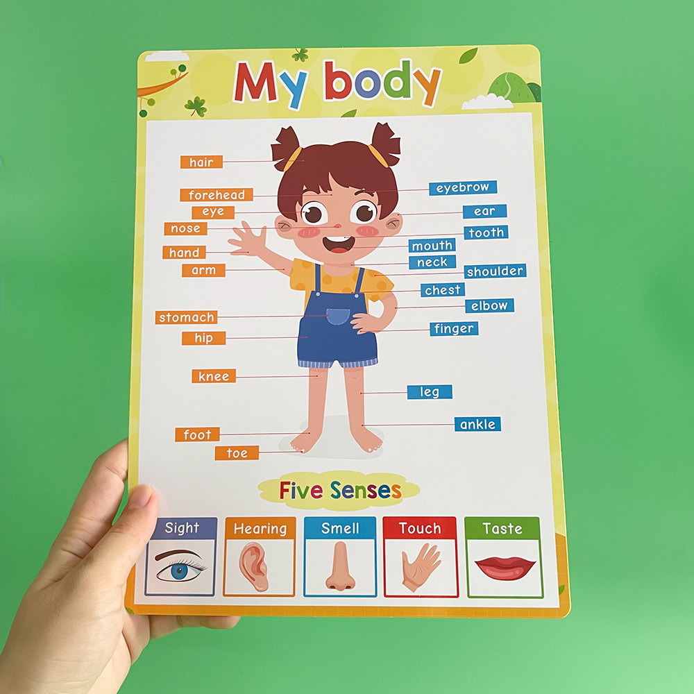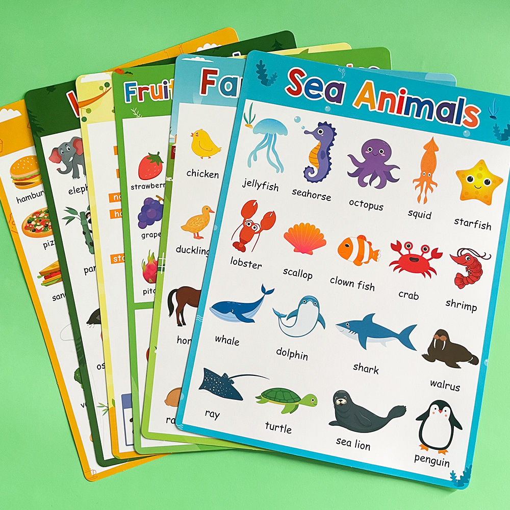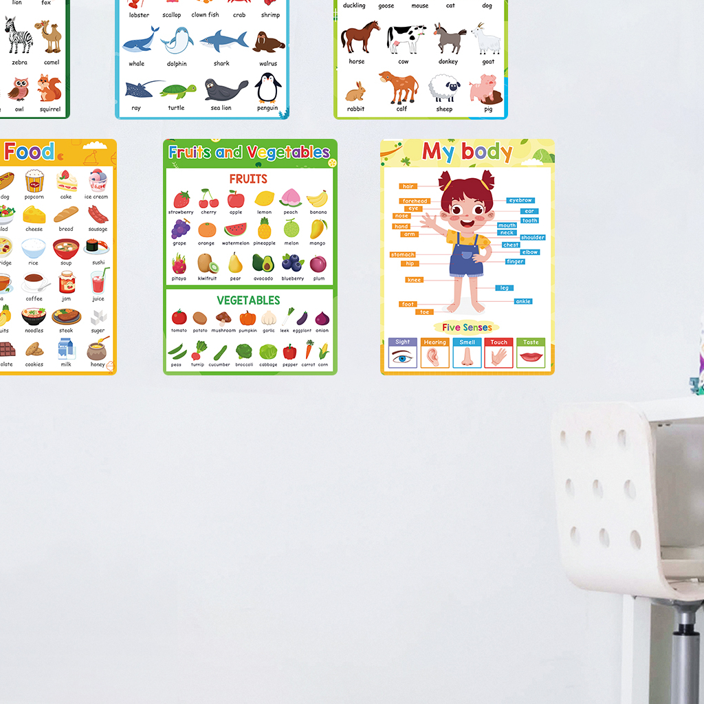 6 Pcs Fruits Food Body Parts Wild/Sea /Farm Animals English Words Classroom A4 Poster Learning Educational Posters for Kids Baby