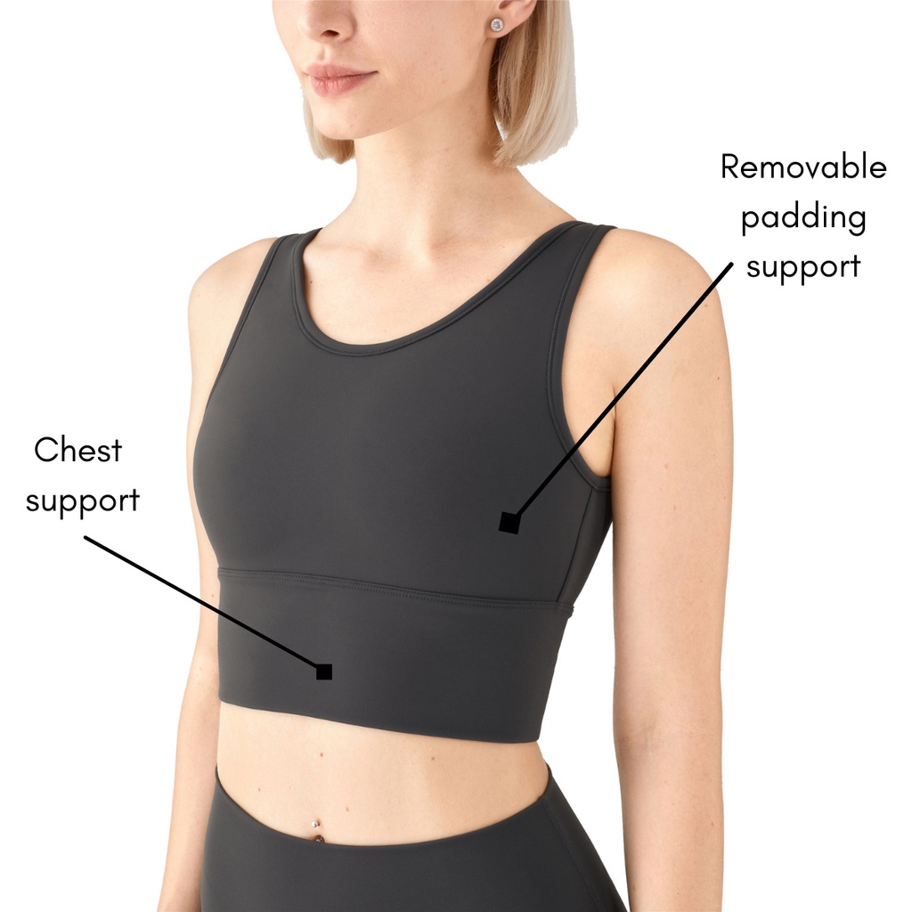 The sports bra comes with removable padding support and is great for yoga, exercising, running, and any form of physical exercise, but also suitable for non intensive physical activities like casual strolls or grocery trips thanks to the quality of material used, cutting and elasticity.