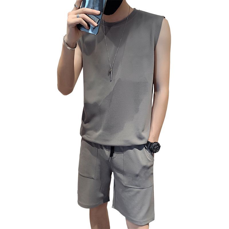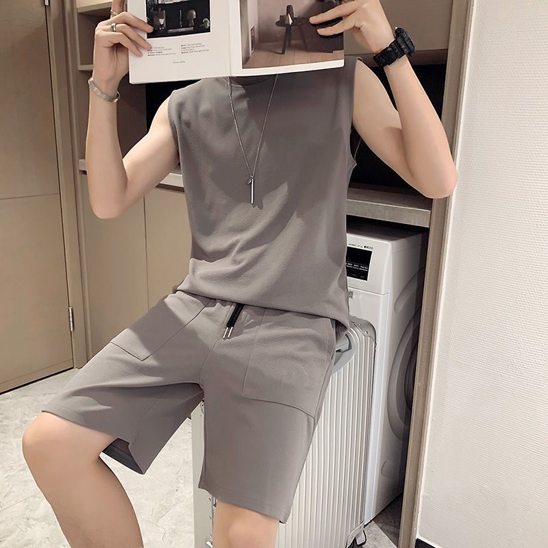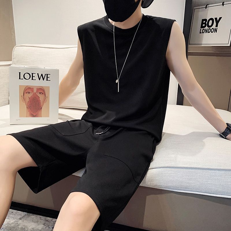 Sleeveless T-shirt suit popular logo fashion leisure male thin vest 2023 men's w无袖T恤套装男潮牌时尚休闲薄背心2023男装一套痞帅搭配